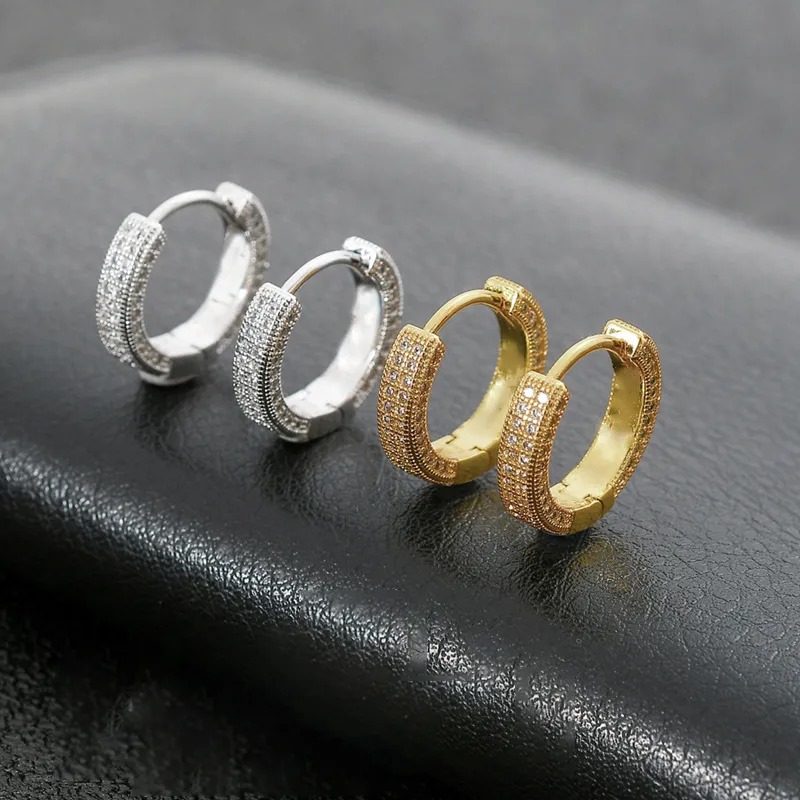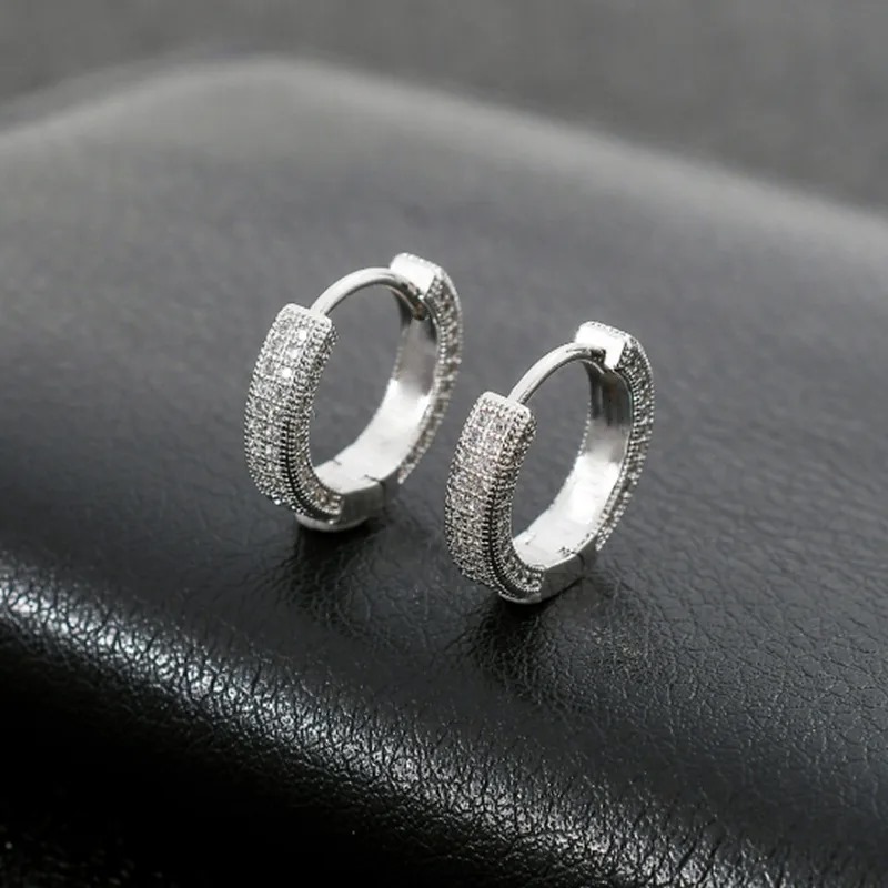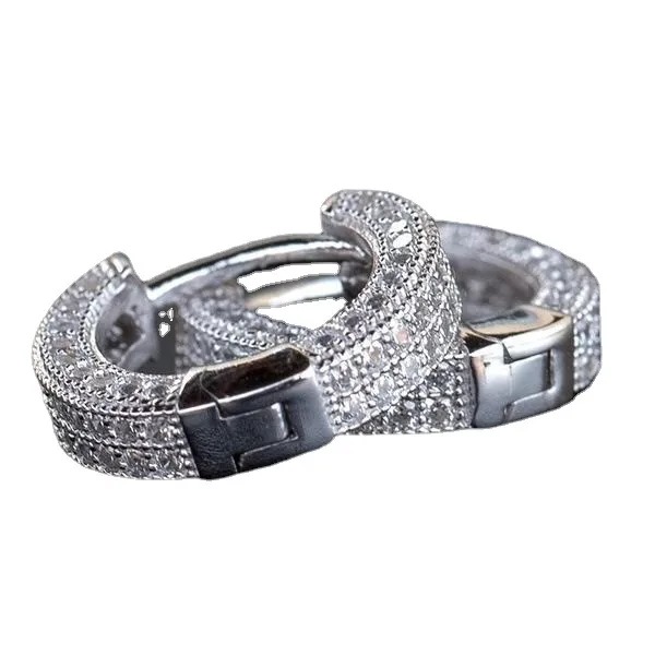 The earring is crafted in a rounded, slightly squared shape and is beautifully inlaid with rows of tiny, sparkling zircon stones that enhance their luxurious appeal. The meticulous plating and high-polish finish give these earrings a refined and sophisticated look, making them perfect for both casual wear and formal occasions. Designed with a secure hinged clasp, they are both stylish and practical, ideal for anyone seeking a timeless accessory with a modern touch.